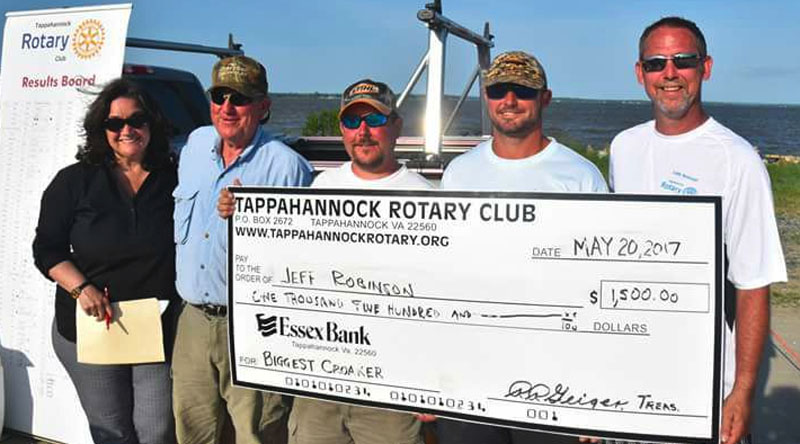 The 2017 tournament winners are: First prize: Jeff Robinson – a returning participant in the tournament from Mechanicsville, VA with a 1.35 lb croaker won $1,500 – his croaker was caught near Downing Bridge using crab bait; second place: Ba Nguyen of Springfield VA with a 1.20 lb croaker won $1,000; third place: Danny Greene of Clover VA with a 1.20 lb croaker won $500. Fourth place: Samuel Harris of Fredericksburg VA brought in a 1.20 lb croaker and fifth place: Son Nguyen of Springfield VA caught a 1.20 lb croaker. Jeff Robinson was also the major winner of several cash prizes for the tournament within a tournament. Contestants with tied weight winning croakers are ranked according to earliest entry date.