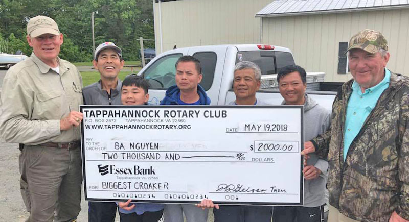 Check for first prize is presented by (left) Carl Strock - Tappahannock Rotary President), Hong Nguyen, Ba’s son Khang Nguyen who won second prize in the youth division, Ba Nguyen (center), My Ho and Loc Truong all of Springfield VA with his family and (right) Jim Wawner Tournament Weigh-Master. Not pictured Jay Brimmer, Tournament Chair.